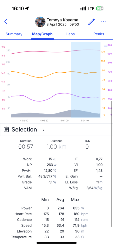 æšæ¥ã®ã·ã§ãŒãã¹ããŒãžãšã¯å察ã«ãæ¬æ¥ã¯178kmã®ã¹ããŒãžã§ããã