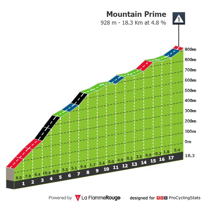 18.3kmで928m登る峠で、最初の6kmくらいまでが斜度がキツイ峠でした。